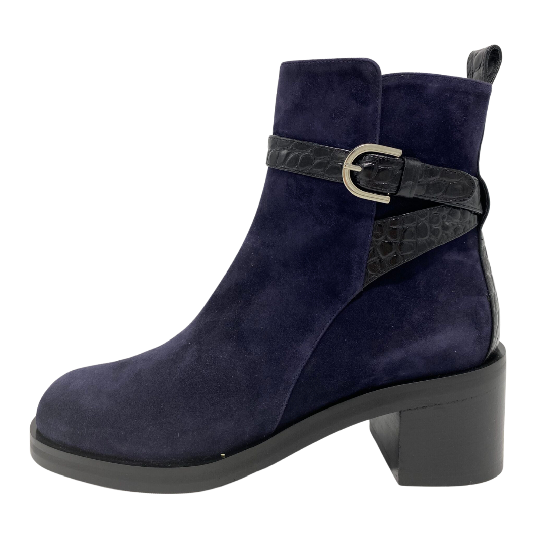 Une petite paire de bottine MARETTO bleu marine d’une matière cuir, nubuck qui terminera parfaitement votre tenue. Avec ses brides de matière croco et ses finitions dorées qui ajoutent une touche de modernité. Sans compter ses talons carrés de 4cm qui s’ajusteront divinement bien à votre pied.