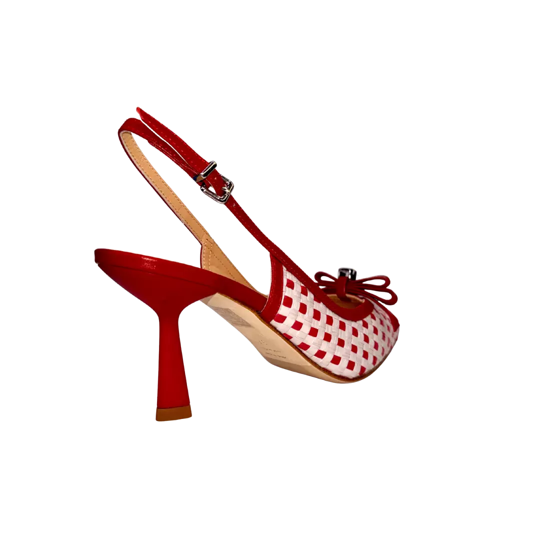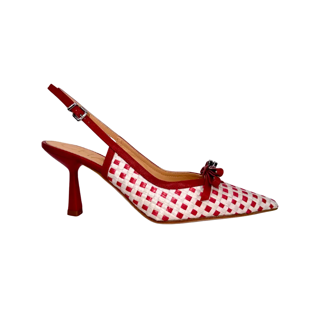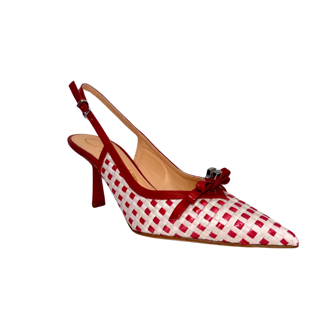 Affirmez votre style avec cet escarpin arrière ouvert à carreaux rouge et blanc signé CHANTAL 1962. Son motif graphique apporte une touche d’originalité assumée, tandis que son nœud délicat à l’avant vient adoucir l’ensemble avec féminité.