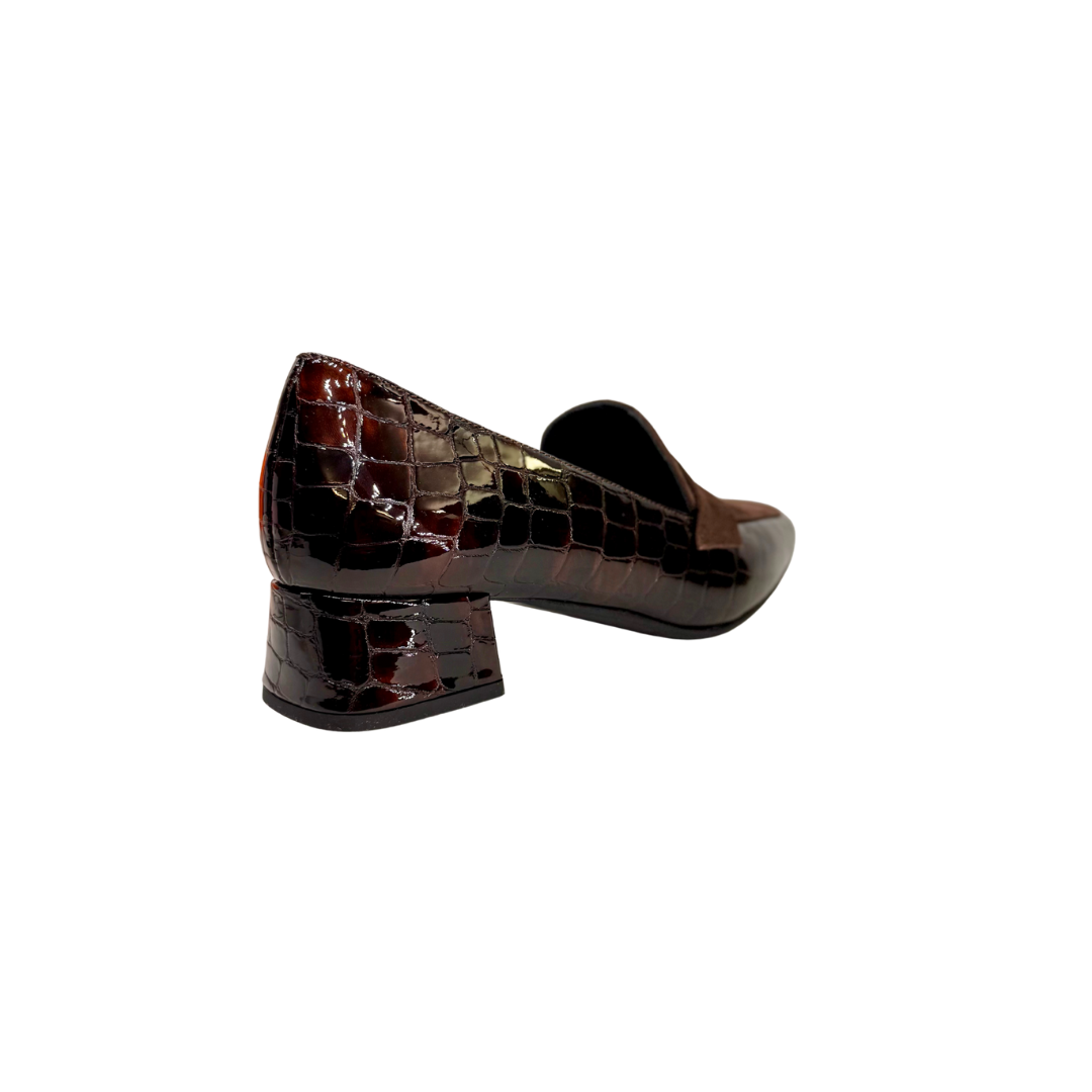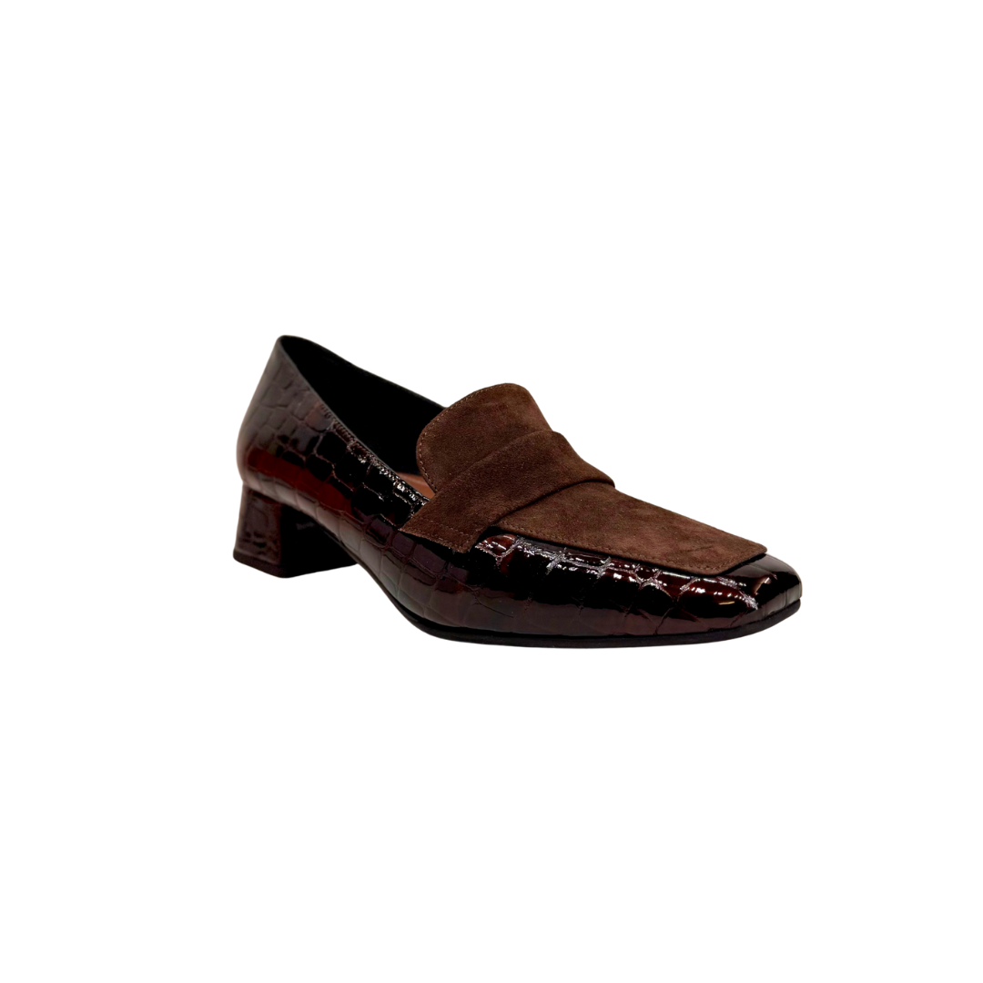 Sophistiqués et féminins, ces mocassins MUSELLA allient subtilement le cuir vernis effet croco marron et le nubuck pour un jeu de textures élégant et moderne.